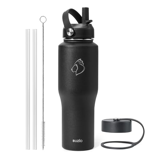 BUZIO Stainless Steel Water Bottle, 40oz Vacuum Insulated Double Wall Leak Proof Sports Water Bottle with Straw Lid and Flex Cap for Gym Travel Campin