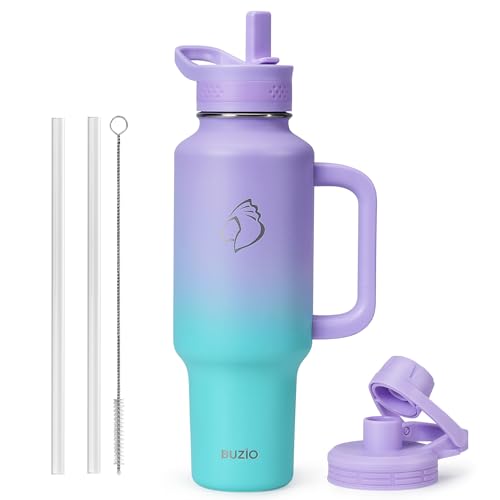 BUZIO 40 oz Insulated Water Bottle Tumbler with Straw and Lids (2 Lids), 40oz Stainless Steel Water Bottles Fits in Any Car Cup Holders, Large Capacit