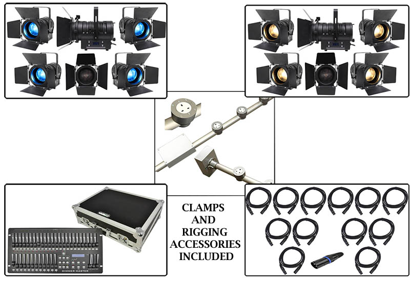 Complete Stage Lighting Installation Package with Powered Lighting Bars and LED Fresnels