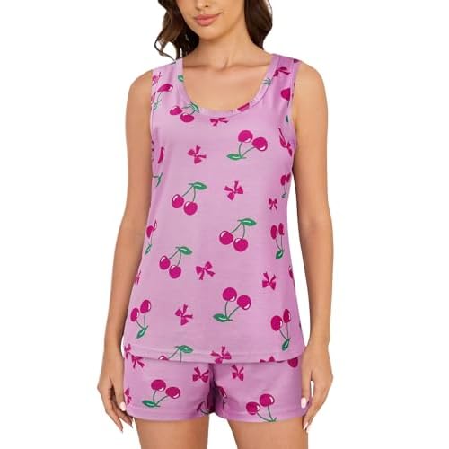 VENTELAN Women Pajamas Cute Tank and Shorts Set Soft PJS Sleepwear Loungewear Small Pink Cherry