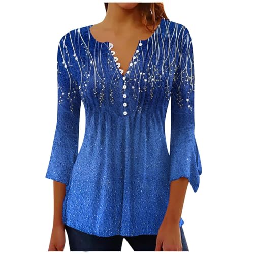 PBNBP Summer Tops for Women 2025 3/4 Sleeve V Neck Blouses Dressy Casual Tee Floral Henley Shirts Fashion Pleated Tunic Top A01 Blue Large