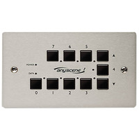 Programmable Wall Mounting DMX Scene Recall Unit. 7 Programmable Pre-Sets plus Blackout. Up to 36 Independent Channels of DMX Control. Simple to Programme from any DMX Lighting Desk or Controller. Jumper Selection of 5 or 10 Second Fade Times. Standard UK Double Surface Rear Box. 1x RJ45 Category 5 Connection Provides both Data & Power. Automatic DMX Backup FeatureDimensions: 148 x 86 x 15mm Weight: 14g. Stylish and easy to use Programmable DMX touch Panel. There are 7 recall scenes buttons each can control up to 36 channels of DMX(0-36). These are simple to programme from any standard DMX controller. Fade rate is selectable via PCB jumpers. Simply connect an RJ45 cable to either the anyscene AS180 power supply or any suitable Anytronic dimmer pack. The panels are finished in brushed stainless steel and fit into a double pattress back box- minimum of 32mm in depth.. Anyscene programmable wall mounted DMX scene recall unit with up to 36 channels of DMX and 7 recall scenes. Supplied with Anyscene AS180 power supply.. dmx lighting controller-dmx wall controller