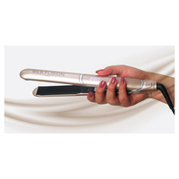 Miraki Silk Fusion Straightener- Champagne\nSilk Fusion digital Straightening Irons by Miraki® - The next generation of hair straighteners. Silk Fusion features crystal titanium plates with a nano silk coating. As a result the straighteners glide through the hair with minimum effort and the ionic affect helps keep hair feeling healthy.\nWith Silk Fusion you can create a variety of looks. Silk Fusion’s curved edge plates and sleek rounded body helps create the perfect curls. The very tip of the straightener remains cool throughout use. This is a nice addition and allows you to gently hold either end of the straightening iron. With 2.5metres of cord that swivals, so that you have freedom of movement in the salon and easily turn your hand while styling. \nSilk Fusion by Miraki® comes in a sophisticated champagne metallic finish that looks fabulous in the hand. Set the modern white LED display as low as 130 degrees with a top temperature of 230.\nBe in total control, set your Silk Fusion to suit any hair type and your styling needs. The temperature can be dialled up or down in 10 degree increments. Silk Fusion has universal voltage and ideal for travel, with a lock switch which keeps the plates closed for easy packing and storage.\nFinally Silk Fusion has an automatic shut off after an hour for your peace of mind.