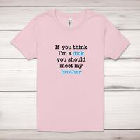 If You Think I'm a Dick Adult T-ShirtA rude unisex adult t-shirt with 'If you think I'm a dick you should meet my ...' choose from either brother or father printed across the front of a 100% cotton* t-shirt. This rude t-shirt is great as a gift for any occasion. Select Design 1 for brother or Design 2 for father, or if you would like anything different please add it to the notes section. All of our unisex adult t-shirts are designed and hand-printed in the UK and are manufactured from 100% ringspun cotton for a premium quality feel and feature double-stitched waist hem and sleeves, seamless double-needle collar, taped neck and shoulders, and a tubular body that has been quarter turned to avoid a centre crease; available in sizes from Extra Small to 4XL*. *Black & White tees available in sizes XS - 4XL, all other colours available XS - 2XL Size GuideUnisex adult t-shirts are measured across the chest, in inchesXS 30/32'S 34/36'M 38/40'L 42/44'XL 46/48'2XL 50/52'3XL 54/56'4XL 58/60'See more on our clothing size guide (opens in new tab)Please NoteAll of our items are hand-printed to order, as a result, colours may vary between prints - images are for illustration purposes only.Show more products with the If You Think I'm a... design