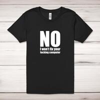 No I Won't Fix Your Fucking Computer Adult T-ShirtA rude unisex adult t-shirt with 'No I Won't Fix Your Fucking Computer' in big, bold lettering printed across the front of a 100% cotton* t-shirt. This rude t-shirt is great as a gift for any occasion.All of our unisex adult t-shirts are designed and hand-printed in the UK and are manufactured from 100% ringspun cotton for a premium quality feel and feature double-stitched waist hem and sleeves, seamless double-needle collar, taped neck and shoulders, and a tubular body that has been quarter turned to avoid a centre crease; available in sizes from Extra Small to 4XL*. *Black & White tees available in sizes XS - 4XL, all other colours available XS - 2XL Size GuideUnisex adult t-shirts are measured across the chest, in inchesXS 30/32'S 34/36'M 38/40'L 42/44'XL 46/48'2XL 50/52'3XL 54/56'4XL 58/60'See more on our clothing size guide (opens in new tab)Please NoteAll of our items are hand-printed to order, as a result, colours may vary between prints - images are for illustration purposes only.Show more products with the No I Won't Fix Your Fucking Computer design