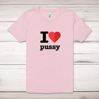 I Love Pussy Adult T-ShirtA rude unisex adult t-shirt with 'I Love Pussy' printed across the front of a 100% cotton* t-shirt. This rude t-shirt is great as a gift for any occasion.All of our unisex adult t-shirts are designed and hand-printed in the UK and are manufactured from 100% ringspun cotton for a premium quality feel and feature double-stitched waist hem and sleeves, seamless double-needle collar, taped neck and shoulders, and a tubular body that has been quarter turned to avoid a centre crease; available in sizes from Extra Small to 4XL*. *Black & White tees available in sizes XS - 4XL, all other colours available XS - 2XL Size GuideUnisex adult t-shirts are measured across the chest, in inchesXS 30/32'S 34/36'M 38/40'L 42/44'XL 46/48'2XL 50/52'3XL 54/56'4XL 58/60'See more on our clothing size guide (opens in new tab)Please NoteAll of our items are hand-printed to order, as a result, colours may vary between prints - images are for illustration purposes only.Show more products with the I Love... design