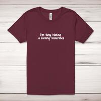 I'm Busy Making A Fucking Difference Adult T-ShirtA rude unisex adult t-shirt with 'I'm Busy Making A Fucking Difference' printed across the front of a 100% cotton* t-shirt. This rude t-shirt is great as a gift for any occasion.All of our unisex adult t-shirts are designed and hand-printed in the UK and are manufactured from 100% ringspun cotton for a premium quality feel and feature double-stitched waist hem and sleeves, seamless double-needle collar, taped neck and shoulders, and a tubular body that has been quarter turned to avoid a centre crease; available in sizes from Extra Small to 4XL*. *Black & White tees available in sizes XS - 4XL, all other colours available XS - 2XL Size GuideUnisex adult t-shirts are measured across the chest, in inchesXS 30/32'S 34/36'M 38/40'L 42/44'XL 46/48'2XL 50/52'3XL 54/56'4XL 58/60'See more on our clothing size guide (opens in new tab)Please NoteAll of our items are hand-printed to order, as a result, colours may vary between prints - images are for illustration purposes only.Show more products with the I'm Busy Making A Fucking Difference design