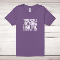 Some People Just Need A High Five Adult T-ShirtA novelty unisex adult t-shirt with 'Some People Just Need A High Five In The Face With A Chair' printed across the front of a 100% cotton* t-shirt. This novelty t-shirt is great as a gift for any occasion.All of our unisex adult t-shirts are designed and hand-printed in the UK and are manufactured from 100% ringspun cotton for a premium quality feel and feature double-stitched waist hem and sleeves, seamless double-needle collar, taped neck and shoulders, and a tubular body that has been quarter turned to avoid a centre crease; available in sizes from Extra Small to 4XL*. *Black & White tees available in sizes XS - 4XL, all other colours available XS - 2XL Size GuideUnisex adult t-shirts are measured across the chest, in inchesXS 30/32'S 34/36'M 38/40'L 42/44'XL 46/48'2XL 50/52'3XL 54/56'4XL 58/60'See more on our clothing size guide (opens in new tab)Please NoteAll of our items are hand-printed to order, as a result, colours may vary between prints - images are for illustration purposes only.Show more products with the Some People Just Need A High Five design
