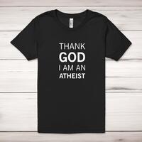 Thank God I'm An Atheist Adult T-ShirtA rude unisex adult t-shirt with 'Thank God I'm An Atheist' printed across the front of a 100% cotton* t-shirt. This rude t-shirt is great as a gift for any occasion.All of our unisex adult t-shirts are designed and hand-printed in the UK and are manufactured from 100% ringspun cotton for a premium quality feel and feature double-stitched waist hem and sleeves, seamless double-needle collar, taped neck and shoulders, and a tubular body that has been quarter turned to avoid a centre crease; available in sizes from Extra Small to 4XL*. *Black & White tees available in sizes XS - 4XL, all other colours available XS - 2XL Size GuideUnisex adult t-shirts are measured across the chest, in inchesXS 30/32'S 34/36'M 38/40'L 42/44'XL 46/48'2XL 50/52'3XL 54/56'4XL 58/60'See more on our clothing size guide (opens in new tab)Please NoteAll of our items are hand-printed to order, as a result, colours may vary between prints - images are for illustration purposes only.Show more products with the Thank God I'm An Atheist design