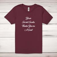 Your Secret Santa Adult T-ShirtA rude unisex adult t-shirt with 'Your Secret Santa Thinks You're A Cunt' printed across the front of a 100% cotton* t-shirt. This rude t-shirt is great as a gift for any occasion.All of our unisex adult t-shirts are designed and hand-printed in the UK and are manufactured from 100% ringspun cotton for a premium quality feel and feature double-stitched waist hem and sleeves, seamless double-needle collar, taped neck and shoulders, and a tubular body that has been quarter turned to avoid a centre crease; available in sizes from Extra Small to 4XL*. *Black & White tees available in sizes XS - 4XL, all other colours available XS - 2XL Size GuideUnisex adult t-shirts are measured across the chest, in inchesXS 30/32'S 34/36'M 38/40'L 42/44'XL 46/48'2XL 50/52'3XL 54/56'4XL 58/60'See more on our clothing size guide (opens in new tab)Please NoteAll of our items are hand-printed to order, as a result, colours may vary between prints - images are for illustration purposes only.Show more products with the Your Secret Santa design