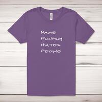 Personalised Fucking Hates People Adult T-ShirtA rude unisex adult t-shirt with '*Name* Fucking Hates People', personalised with your chosen name printed across the front of a 100% cotton* t-shirt. This rude t-shirt is great as a gift for any occasion.All of our unisex adult t-shirts are designed and hand-printed in the UK and are manufactured from 100% ringspun cotton for a premium quality feel and feature double-stitched waist hem and sleeves, seamless double-needle collar, taped neck and shoulders, and a tubular body that has been quarter turned to avoid a centre crease; available in sizes from Extra Small to 4XL*. *Black & White tees available in sizes XS - 4XL, all other colours available XS - 2XL Size GuideUnisex adult t-shirts are measured across the chest, in inchesXS 30/32'S 34/36'M 38/40'L 42/44'XL 46/48'2XL 50/52'3XL 54/56'4XL 58/60'See more on our clothing size guide (opens in new tab)Please NoteAll of our items are hand-printed to order, as a result, colours may vary between prints - images are for illustration purposes only.Show more products with the Personalised Fucking Hates People design