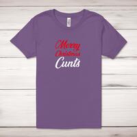 Merry Christmas Cunts Adult T-ShirtA rude unisex adult t-shirt with 'Merry Christmas Cunts' printed across the front of a 100% cotton* t-shirt. This rude t-shirt is great as a gift for any occasion.All of our unisex adult t-shirts are designed and hand-printed in the UK and are manufactured from 100% ringspun cotton for a premium quality feel and feature double-stitched waist hem and sleeves, seamless double-needle collar, taped neck and shoulders, and a tubular body that has been quarter turned to avoid a centre crease; available in sizes from Extra Small to 4XL*. *Black & White tees available in sizes XS - 4XL, all other colours available XS - 2XL Size GuideUnisex adult t-shirts are measured across the chest, in inchesXS 30/32'S 34/36'M 38/40'L 42/44'XL 46/48'2XL 50/52'3XL 54/56'4XL 58/60'See more on our clothing size guide (opens in new tab)Please NoteAll of our items are hand-printed to order, as a result, colours may vary between prints - images are for illustration purposes only.Show more products with the Merry Christmas Cunts design