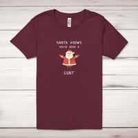 Santa Knows You've Been A Cunt Adult T-ShirtA rude unisex adult t-shirt with 'Santa Knows You've Been A Cunt' printed across the front of a 100% cotton* t-shirt. This rude t-shirt is great as a gift for any occasion.All of our unisex adult t-shirts are designed and hand-printed in the UK and are manufactured from 100% ringspun cotton for a premium quality feel and feature double-stitched waist hem and sleeves, seamless double-needle collar, taped neck and shoulders, and a tubular body that has been quarter turned to avoid a centre crease; available in sizes from Extra Small to 4XL*. *Black & White tees available in sizes XS - 4XL, all other colours available XS - 2XL Size GuideUnisex adult t-shirts are measured across the chest, in inchesXS 30/32'S 34/36'M 38/40'L 42/44'XL 46/48'2XL 50/52'3XL 54/56'4XL 58/60'See more on our clothing size guide (opens in new tab)Please NoteAll of our items are hand-printed to order, as a result, colours may vary between prints - images are for illustration purposes only.Show more products with the Santa Knows design