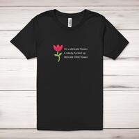 I'm A Delicate Flower Adult T-ShirtA rude unisex adult t-shirt with 'I'm a delicate flower.A needy,fucked up delicate little flower.' printed across the front of a 100% cotton* t-shirt. This rude t-shirt is great as a gift for any occasion.All of our unisex adult t-shirts are designed and hand-printed in the UK and are manufactured from 100% ringspun cotton for a premium quality feel and feature double-stitched waist hem and sleeves, seamless double-needle collar, taped neck and shoulders, and a tubular body that has been quarter turned to avoid a centre crease; available in sizes from Extra Small to 4XL*. *Black & White tees available in sizes XS - 4XL, all other colours available XS - 2XL Size GuideUnisex adult t-shirts are measured across the chest, in inchesXS 30/32'S 34/36'M 38/40'L 42/44'XL 46/48'2XL 50/52'3XL 54/56'4XL 58/60'See more on our clothing size guide (opens in new tab)Please NoteAll of our items are hand-printed to order, as a result, colours may vary between prints - images are for illustration purposes only.Show more products with the I'm A Delicate Flower design