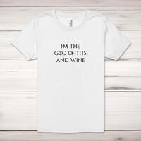 God Of Tits And Wine Adult T-ShirtA novelty unisex adult t-shirt with 'I'm The God Of Tits And Wine' printed across the front of a 100% cotton* t-shirt. This novelty t-shirt is great as a gift for any occasion.All of our unisex adult t-shirts are designed and hand-printed in the UK and are manufactured from 100% ringspun cotton for a premium quality feel and feature double-stitched waist hem and sleeves, seamless double-needle collar, taped neck and shoulders, and a tubular body that has been quarter turned to avoid a centre crease; available in sizes from Extra Small to 4XL*. *Black & White tees available in sizes XS - 4XL, all other colours available XS - 2XL Size GuideUnisex adult t-shirts are measured across the chest, in inchesXS 30/32'S 34/36'M 38/40'L 42/44'XL 46/48'2XL 50/52'3XL 54/56'4XL 58/60'See more on our clothing size guide (opens in new tab)Please NoteAll of our items are hand-printed to order, as a result, colours may vary between prints - images are for illustration purposes only.Show more products with the I'm The God Of Tits And Wine design