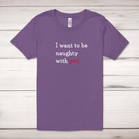 Naughty With You Adult T-ShirtA novelty unisex adult t-shirt with 'I Want To Be Naughty With You' printed across the front of a 100% cotton* t-shirt. This novelty t-shirt is great as a gift for any occasion.All of our unisex adult t-shirts are designed and hand-printed in the UK and are manufactured from 100% ringspun cotton for a premium quality feel and feature double-stitched waist hem and sleeves, seamless double-needle collar, taped neck and shoulders, and a tubular body that has been quarter turned to avoid a centre crease; available in sizes from Extra Small to 4XL*. *Black & White tees available in sizes XS - 4XL, all other colours available XS - 2XL Size GuideUnisex adult t-shirts are measured across the chest, in inchesXS 30/32'S 34/36'M 38/40'L 42/44'XL 46/48'2XL 50/52'3XL 54/56'4XL 58/60'See more on our clothing size guide (opens in new tab)Please NoteAll of our items are hand-printed to order, as a result, colours may vary between prints - images are for illustration purposes only.Show more products with the Naughty With You design