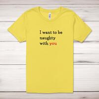 Naughty With You Adult T-ShirtA novelty unisex adult t-shirt with 'I Want To Be Naughty With You' printed across the front of a 100% cotton* t-shirt. This novelty t-shirt is great as a gift for any occasion.All of our unisex adult t-shirts are designed and hand-printed in the UK and are manufactured from 100% ringspun cotton for a premium quality feel and feature double-stitched waist hem and sleeves, seamless double-needle collar, taped neck and shoulders, and a tubular body that has been quarter turned to avoid a centre crease; available in sizes from Extra Small to 4XL*. *Black & White tees available in sizes XS - 4XL, all other colours available XS - 2XL Size GuideUnisex adult t-shirts are measured across the chest, in inchesXS 30/32'S 34/36'M 38/40'L 42/44'XL 46/48'2XL 50/52'3XL 54/56'4XL 58/60'See more on our clothing size guide (opens in new tab)Please NoteAll of our items are hand-printed to order, as a result, colours may vary between prints - images are for illustration purposes only.Show more products with the Naughty With You design