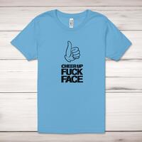 Cheer Up Fuck Face Adult T-ShirtA rude unisex adult t-shirt with 'Cheer Up Fuck Face' printed across the front of a 100% cotton* t-shirt. This rude t-shirt is great as a gift for any occasion.All of our unisex adult t-shirts are designed and hand-printed in the UK and are manufactured from 100% ringspun cotton for a premium quality feel and feature double-stitched waist hem and sleeves, seamless double-needle collar, taped neck and shoulders, and a tubular body that has been quarter turned to avoid a centre crease; available in sizes from Extra Small to 4XL*. *Black & White tees available in sizes XS - 4XL, all other colours available XS - 2XL Size GuideUnisex adult t-shirts are measured across the chest, in inchesXS 30/32'S 34/36'M 38/40'L 42/44'XL 46/48'2XL 50/52'3XL 54/56'4XL 58/60'See more on our clothing size guide (opens in new tab)Please NoteAll of our items are hand-printed to order, as a result, colours may vary between prints - images are for illustration purposes only.Show more products with the Cheer Up Fuck Face design