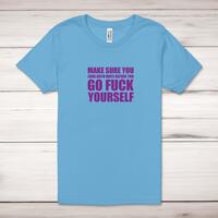 Before You Go Fuck Yourself Adult T-ShirtA rude unisex adult t-shirt with 'Make Sure You Look Both Ways Before You Go Fuck Yourself' printed across the front of a 100% cotton* t-shirt. This rude t-shirt is great as a gift for any occasion.All of our unisex adult t-shirts are designed and hand-printed in the UK and are manufactured from 100% ringspun cotton for a premium quality feel and feature double-stitched waist hem and sleeves, seamless double-needle collar, taped neck and shoulders, and a tubular body that has been quarter turned to avoid a centre crease; available in sizes from Extra Small to 4XL*. *Black & White tees available in sizes XS - 4XL, all other colours available XS - 2XL Size GuideUnisex adult t-shirts are measured across the chest, in inchesXS 30/32'S 34/36'M 38/40'L 42/44'XL 46/48'2XL 50/52'3XL 54/56'4XL 58/60'See more on our clothing size guide (opens in new tab)Please NoteAll of our items are hand-printed to order, as a result, colours may vary between prints - images are for illustration purposes only.Show more products with the Before You Go Fuck Yourself design
