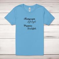 Champagne Lifestyle, Prosecco Budget Adult T-ShirtA novelty unisex adult t-shirt with 'Champagne Lifestyle, Prosecco Budget' printed across the front of a 100% cotton* t-shirt. This novelty t-shirt is great as a gift for any occasion.All of our unisex adult t-shirts are designed and hand-printed in the UK and are manufactured from 100% ringspun cotton for a premium quality feel and feature double-stitched waist hem and sleeves, seamless double-needle collar, taped neck and shoulders, and a tubular body that has been quarter turned to avoid a centre crease; available in sizes from Extra Small to 4XL*. *Black & White tees available in sizes XS - 4XL, all other colours available XS - 2XL Size GuideUnisex adult t-shirts are measured across the chest, in inchesXS 30/32'S 34/36'M 38/40'L 42/44'XL 46/48'2XL 50/52'3XL 54/56'4XL 58/60'See more on our clothing size guide (opens in new tab)Please NoteAll of our items are hand-printed to order, as a result, colours may vary between prints - images are for illustration purposes only.Show more products with the Champagne Lifestyle, Prosecco Budget design