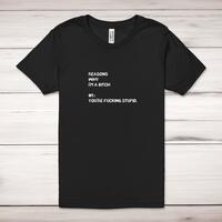 Reasons Why I'm A Bitch Adult T-ShirtA rude unisex adult t-shirt with 'Reasons Why I'm A Bitch #1: You're Fucking Stupid.' printed across the front of a 100% cotton* t-shirt. This rude t-shirt is great as a gift for any occasion.All of our unisex adult t-shirts are designed and hand-printed in the UK and are manufactured from 100% ringspun cotton for a premium quality feel and feature double-stitched waist hem and sleeves, seamless double-needle collar, taped neck and shoulders, and a tubular body that has been quarter turned to avoid a centre crease; available in sizes from Extra Small to 4XL*. *Black & White tees available in sizes XS - 4XL, all other colours available XS - 2XL Size GuideUnisex adult t-shirts are measured across the chest, in inchesXS 30/32'S 34/36'M 38/40'L 42/44'XL 46/48'2XL 50/52'3XL 54/56'4XL 58/60'See more on our clothing size guide (opens in new tab)Please NoteAll of our items are hand-printed to order, as a result, colours may vary between prints - images are for illustration purposes only.Show more products with the Reasons Why I'm A Bitch design
