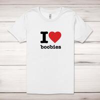 I Love Boobies Adult T-ShirtA novelty unisex adult t-shirt with 'I Love Boobies' printed across the front of a 100% cotton* t-shirt. This novelty t-shirt is great as a gift for any occasion.All of our unisex adult t-shirts are designed and hand-printed in the UK and are manufactured from 100% ringspun cotton for a premium quality feel and feature double-stitched waist hem and sleeves, seamless double-needle collar, taped neck and shoulders, and a tubular body that has been quarter turned to avoid a centre crease; available in sizes from Extra Small to 4XL*. *Black & White tees available in sizes XS - 4XL, all other colours available XS - 2XL Size GuideUnisex adult t-shirts are measured across the chest, in inchesXS 30/32'S 34/36'M 38/40'L 42/44'XL 46/48'2XL 50/52'3XL 54/56'4XL 58/60'See more on our clothing size guide (opens in new tab)Please NoteAll of our items are hand-printed to order, as a result, colours may vary between prints - images are for illustration purposes only.Show more products with the I Love Boobies design
