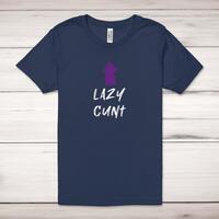 Lazy Cunt Adult T-ShirtA rude unisex adult t-shirt with 'Lazy Cunt' printed across the front of a 100% cotton* t-shirt. This rude t-shirt is great as a gift for any occasion.All of our unisex adult t-shirts are designed and hand-printed in the UK and are manufactured from 100% ringspun cotton for a premium quality feel and feature double-stitched waist hem and sleeves, seamless double-needle collar, taped neck and shoulders, and a tubular body that has been quarter turned to avoid a centre crease; available in sizes from Extra Small to 4XL*. *Black & White tees available in sizes XS - 4XL, all other colours available XS - 2XL Size GuideUnisex adult t-shirts are measured across the chest, in inchesXS 30/32'S 34/36'M 38/40'L 42/44'XL 46/48'2XL 50/52'3XL 54/56'4XL 58/60'See more on our clothing size guide (opens in new tab)Please NoteAll of our items are hand-printed to order, as a result, colours may vary between prints - images are for illustration purposes only.Show more products with the Lazy Cunt design