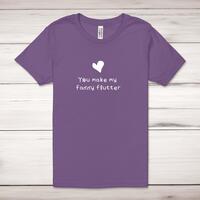 You Make My Fanny Flutter Adult T-ShirtA rude unisex adult t-shirt with 'You Make My Fanny Flutter' printed across the front of a 100% cotton* t-shirt. This rude t-shirt is great as a gift for any occasion.All of our adult t-shirts are designed and hand-printed in the UK and are manufactured from quality 100% combed and ringspun cotton for superior softness and comfort. This updated unisex essential fits like a well-loved favorite; featuring a crew neck, short sleeves, retail fit, unisex sizing, sideseams and shoulder taping. Available in sizes from Extra Small to 4XL*.*Black & White tees available in sizes XS - 4XL, all other colours available XS - 2XLSize GuideUnisex adult t-shirts are measured around the chest, in inchesXS 32/34'S 34/36'M 38/40'L 42/44'XL 46/48'2XL 50/52'3XL 54/56'4XL 58/60'See more on our clothing size guide (opens in new tab)Please NoteAll of our items are hand-printed to order, as a result, colours may vary between prints - images are for illustration purposes only.Show more products with the You Make My Fanny Flutter design
