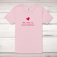 You Make My Fanny Flutter Adult T-ShirtA rude unisex adult t-shirt with 'You Make My Fanny Flutter' printed across the front of a 100% cotton* t-shirt. This rude t-shirt is great as a gift for any occasion.All of our adult t-shirts are designed and hand-printed in the UK and are manufactured from quality 100% combed and ringspun cotton for superior softness and comfort. This updated unisex essential fits like a well-loved favorite; featuring a crew neck, short sleeves, retail fit, unisex sizing, sideseams and shoulder taping. Available in sizes from Extra Small to 4XL*.*Black & White tees available in sizes XS - 4XL, all other colours available XS - 2XLSize GuideUnisex adult t-shirts are measured around the chest, in inchesXS 32/34'S 34/36'M 38/40'L 42/44'XL 46/48'2XL 50/52'3XL 54/56'4XL 58/60'See more on our clothing size guide (opens in new tab)Please NoteAll of our items are hand-printed to order, as a result, colours may vary between prints - images are for illustration purposes only.Show more products with the You Make My Fanny Flutter design