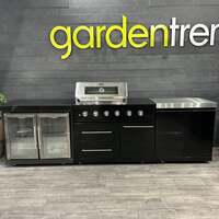 PLEASE NOTE: THIS IS AN EX-DISPLAY UNIT AND CAN BE VIEWED AT OUR MOSS END STORE. We would strongly advise visiting the store to view this barbecue or having a video call to view it. Price is for collection only from Bracknell (RG42) but delivery may be able to be arranged at an extra cost. This Draco Grills Fusion Black Modular Outdoor Kitchen comes with everything you need to construct your ideal outdoor cooking space. This set-up comes with a double-door cabinet, a sink, and a 6 burner gas BBQ. Large gatherings of people can be readily fed by the BBQ thanks to its roomy cooking surface. It is durable and strong. Its sleek, contemporary design and gorgeous matte black finish will look amazing in any garden. The grill's six burners allow you to cook flavourful steaks, sausages, and burgers to absolute perfection. This allows you to prepare multiple dishes simultaneously. It also features a black hood with a temperature gauge, a cool-to-touch bar handle and a sizeable viewing window. Barbecue Features Attractive matt black finish Full stainless steel cooking box Heat retaining cast iron cooking grills Battery powered illuminated control knobs - requires no mains connection (only 4x AAA batteries) - blue LED lighting Manual Piezo ignition for effortless lighting High grade stainless steel tube burners offering consistent flame control providing heat efficient distribution Stainless steel flame tamers Easy to clean fat collection tray Matt black recessed fascia panel Double-door cabinet underneath the BBQ with a fixed holder inside for storing 5kg gas bottles Hidden locking castor wheels Quick access feet for levelling Black hood with large viewing window and cool-to-touch bar handle Temperature gauge Can be converted to Natural Gas with a conversion kit CE Certified Cooking Area: 92.6cm x 45.5cm (4213.3cm²) Output per Burner: 12,000 BTU (3.55kW) Total Heat Output: 72,000 BTU (21.3kW) Dimensions: 118cm (H) x 110cm (W) x 60.9cm Fusion Double Cabinet Features & Specifications 15mm deep sintered stone worktop Stainless steel handles Locking castor wheels with built in feet for levelling CE certified Dimensions: 90cm (H) x 83cm (W) x 57.6cm (D) Fusion Side Burner Features & Specifications 1 cupboard for storage of 5kg gas bottle Stainless steel cooking grill Powerful twin ring burner 4x easy levelling feet (accessed from inside the cabinet) Simple to maintain fat collection tray 15mm deep sintered stone top Stainless steel handle Easy adjustment for high heat boiling or gentle simmer Supplied with LPG regulator and hose Can be converted to Natural Gas with a conversion kit CE/UKCA certified Maximum Heat Output: 4.5Kw Dimensions: 90cm (H) x 48.7cm (W) x 57.6cm (D) Outdoor Kitchen Dimensions Width: 242cm Height: 90cm (120cm to top of hood) Depth: 57.7cm