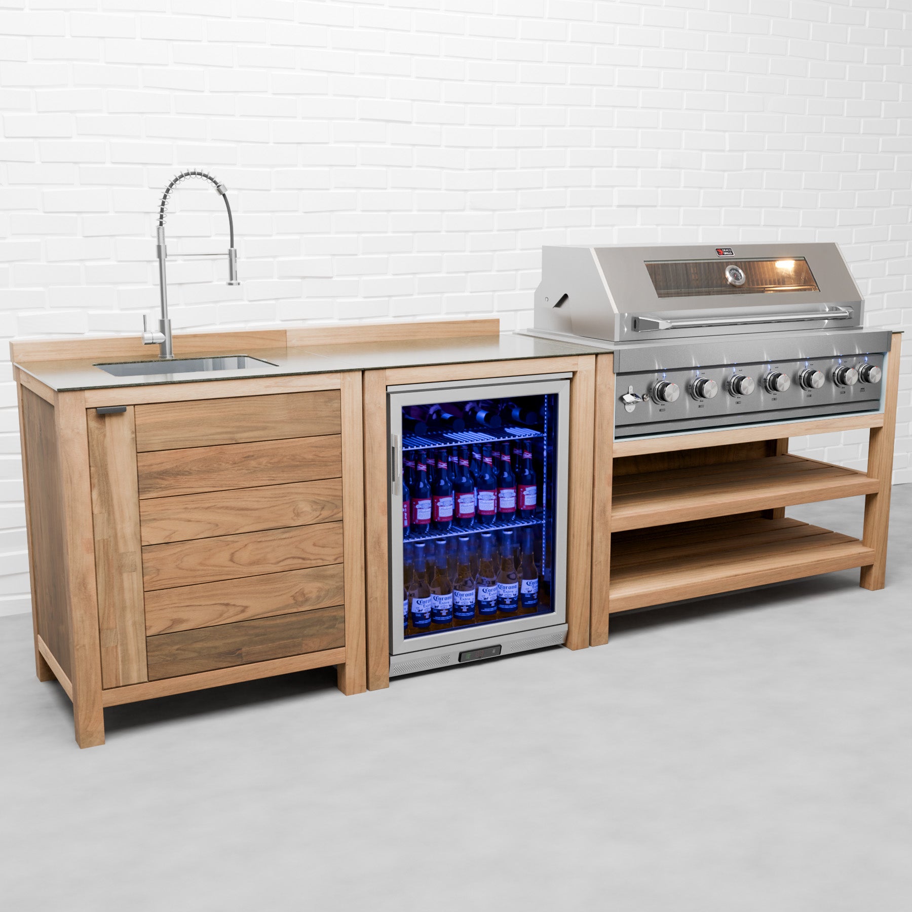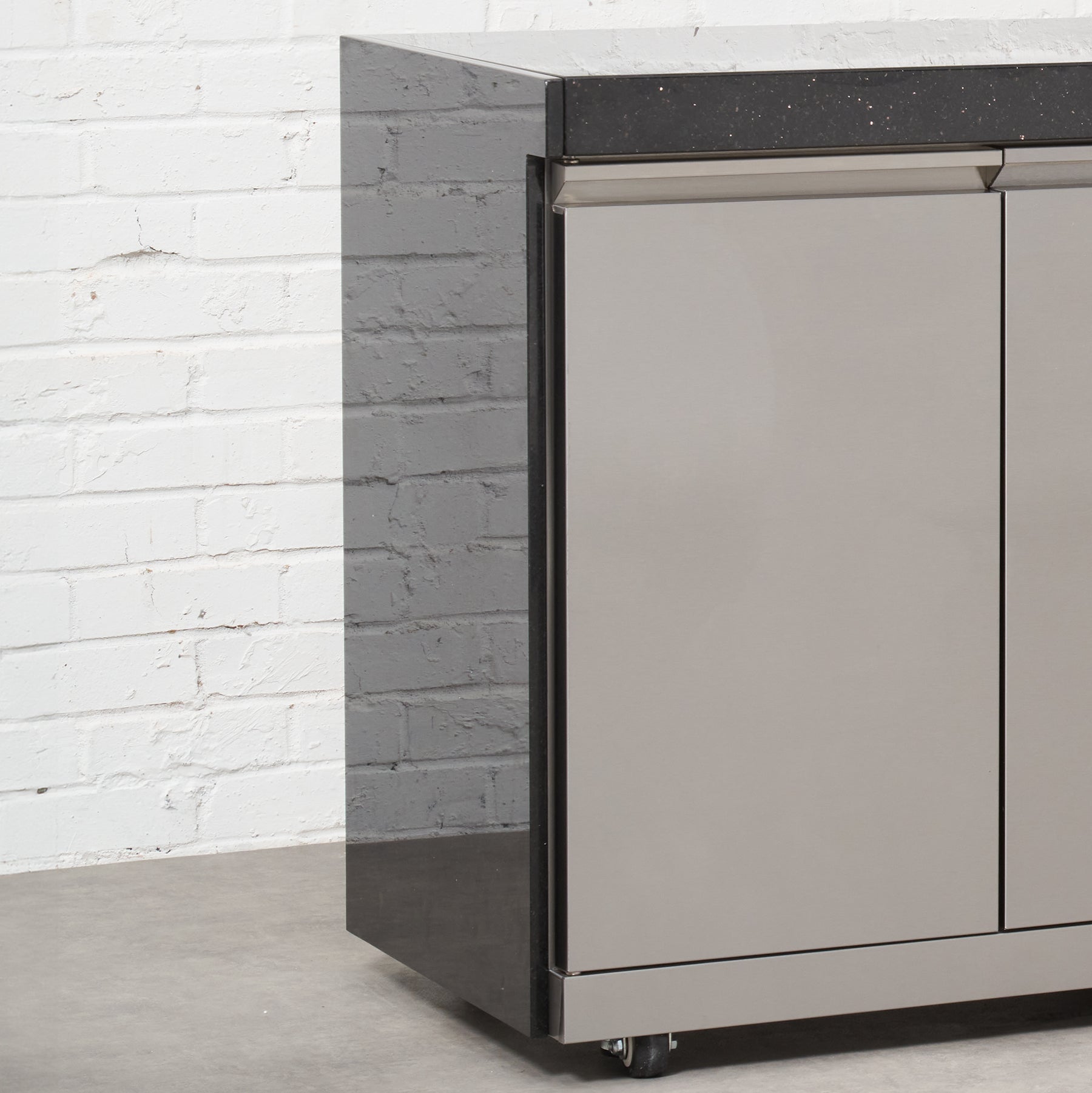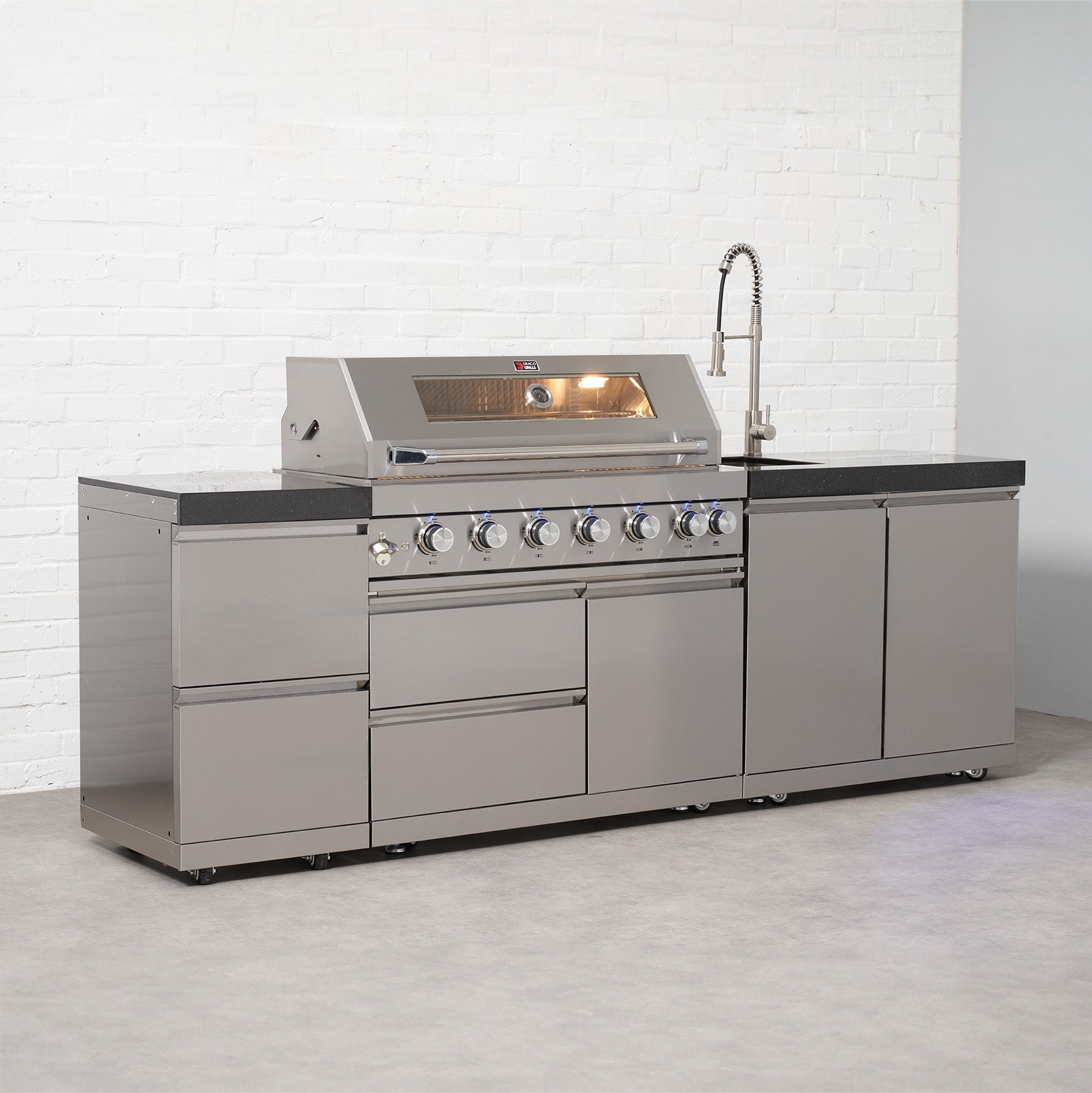 The Draco Grills Nero Modular Outdoor Kitchen is a luxury configuration that does it all! This Modular Outdoor Kitchen arrangement is just one of the limitless combinations to create a stunning outdoor cooking space. This Nero Outdoor Kitchen contains a Nero 6 burner BBQ, double cabinet, and a Nero double fridge unit. The smooth lines of the Black Stainless Steel give a sleek, modern look that will create an Outdoor Kitchen with style. Now with an extra-deep cabinet construction which gives even more worktop space and soft close doors/drawers for an added touch of class. A full 304 grade Black stainless steel construction, finished with a stunning granite top. It is perfect for those seeking a quality, robust weather resistant kitchen. The Nero 6 Burner Barbecue comprises of a double skinned black stainless steel dome hood with 'cool to touch' technology, cast stainless steel "Power" burners give a consistent flame from front to back, providing even and efficient heat distribution, teamed with a ceramic infrared rear burner, for perfect grilling. The burner controls have individual back light colour changing from white to red, indicating which burners are in use. The whole barbecue is constructed from high corrosion resistant solid 304 grade stainless to the burner box and framework. The barbecue can be converted to Natural Gas with a Draco Grills Outdoor Kitchen Natural Gas Conversion Kit (DRA9941) . Keeping with the quality materials the double fridge unit is constructed from the same high grade 304 stainless steel to both externally and internally. With easy to use touch pad digital controls and fully adjustable shelves offering plenty of storage for drinks, the fridge is the perfect addition for any sophisticated outdoor kitchen. The fridges can be operated without having to open the door with temperatures between 2 and 10 degrees Celsius for the coldest of drinks on the warmest of days. The double cabinet is half open/half shelved, allowing both small and larger items to be kept inside; from your cooking utensils, cutlery or crockery, even a large wastebin. All within a compact and solid 304 grade stainless steel frame with a stunning granite top. This Nero Outdoor Kitchen by Draco Grills offers everything you could desire to create a kitchen that not only will be the envy of others but. Draco Grills 6 Burner BBQ Black Stainless Steel Modular Outdoor Kitchen with Double Fridge & Double Cabinet, Early May 2025 / Without Side Panels