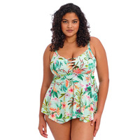 Look forward to feeling the beachy breeze in this gorgeous Elomi Sunshine Cove non-wired tankini top! This beautiful tankini top is cut from printed fabric with LYCRA XTRA LIFE and has a tropical flower print that's sure to turn heads. It has a scooped neckline for full cup coverage, non-wired construction to ensure maximum comfort and non-padded cups to keep your natural shape. The bust area is lined with light foam cups and it also features adjustable shoulder straps as well as an upper back panel with powernet lining for extra support. Plus, you'll love the centre front cutouts with strapping detail and gently flared tankini shape falling to a handkerchief-style hem. Whether you're looking for a two-piece set or want to mix and match various pieces - there are also matching coordinates available so you can find the style that best suits your needs.