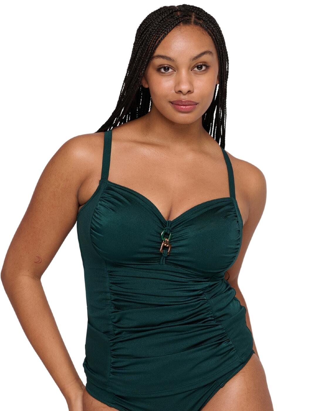 Craft a stylish look on your next holiday with this beautiful, everyday plunge tankini top from Freya's Nomad Nights collection. Sure to become a staple in your swimwear wardrobe thanks to its flattering and comfortable features, and the plunging neckline that accentuates your cleavage and celebrates your curves! The underwired, lined cups give you effortless support and a beautiful shape that will leave you feeling confident all day long. The fully adjustable shoulder straps allow you to customise the fit as you desire, and the decorative bead and metal ring trims between the cups finish off this piece with an eye-catching detail for extra panache! Pair with coordinating briefs from the Nomad Nights range to complete the look!