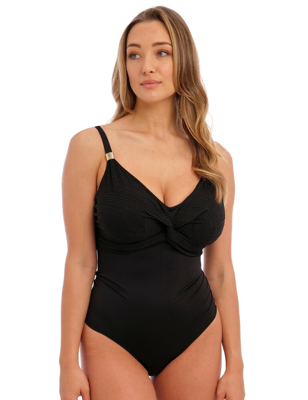 Make a splash with the V-neck swimsuit from Fantasie's Seraya Sands range! This bold, underwired swimsuit features a flattering V-neckline to accentuate your features and adjustable tie sides for the perfect custom fit. With an alterable ruching effect on the tummy area and non-padded cups, this swimsuit compliments your natural shape while offering moderate rear coverage to fill you with confidence with every wear. The low-scoop back creates a sleek body line and a chic feel, which is amplified by the metallic detailing on the swimsuit's apex. For the perfect poolside look, pair this swimsuit with a matching kaftan from the Seraya Sands collection.