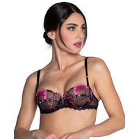 Blending the alluring elegance of striking embroidery and sheer tulle, the Floraison Passion range by Lise Charmel is not one to miss out on! It introduces this half cup bra, which beautifully flatters your bust and with its non-padded underwired cups, it provides a natural but supportive fit. This bra features sexy sheer tulle cups with gorgeous embroidery running across the cup and is made complete with rhinestones up the straps for an added feminine touch. It's guaranteed to fit perfectly thanks to the adjustable straps and hook-and-eye closure. Pair this beautiful piece with the coordinating pieces also available.
