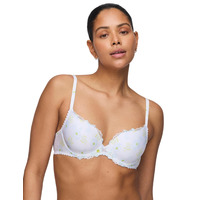 Treat yourself with this feminine heart shaped bra from Marie Jo's Chen collection. Featuring padded cups giving you a lovely rounded shape and underwiring for a natural boost. It has a flattering deep plunge neckline that compliments your cleavage and creates a flattering silhouette. Embellished with stunning floral embroidery over the opaque cups and beautiful sheer polka dot fabric on the back band with scalloped edges for an irresistible look. Create a comfortable fit thanks to the adjustable straps and hook and eye closure. Pair this gorgeous bra with the matching coordinates that are available to finish the look!